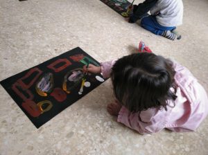 Los elementos geométricos tienen una gran importancia en su obra y nosotros lo hemos llevado a cabo mientras escuchábamos a Vivaldi. Recordamos las formas geométricas (la actividad se hace en inglés) y cambiamos de posición y cartulina conforme para y se reanuda la música. Así, poco a poco y cada uno con un color diferente, hemos creado unas obras de elementos geométricos coloridos.